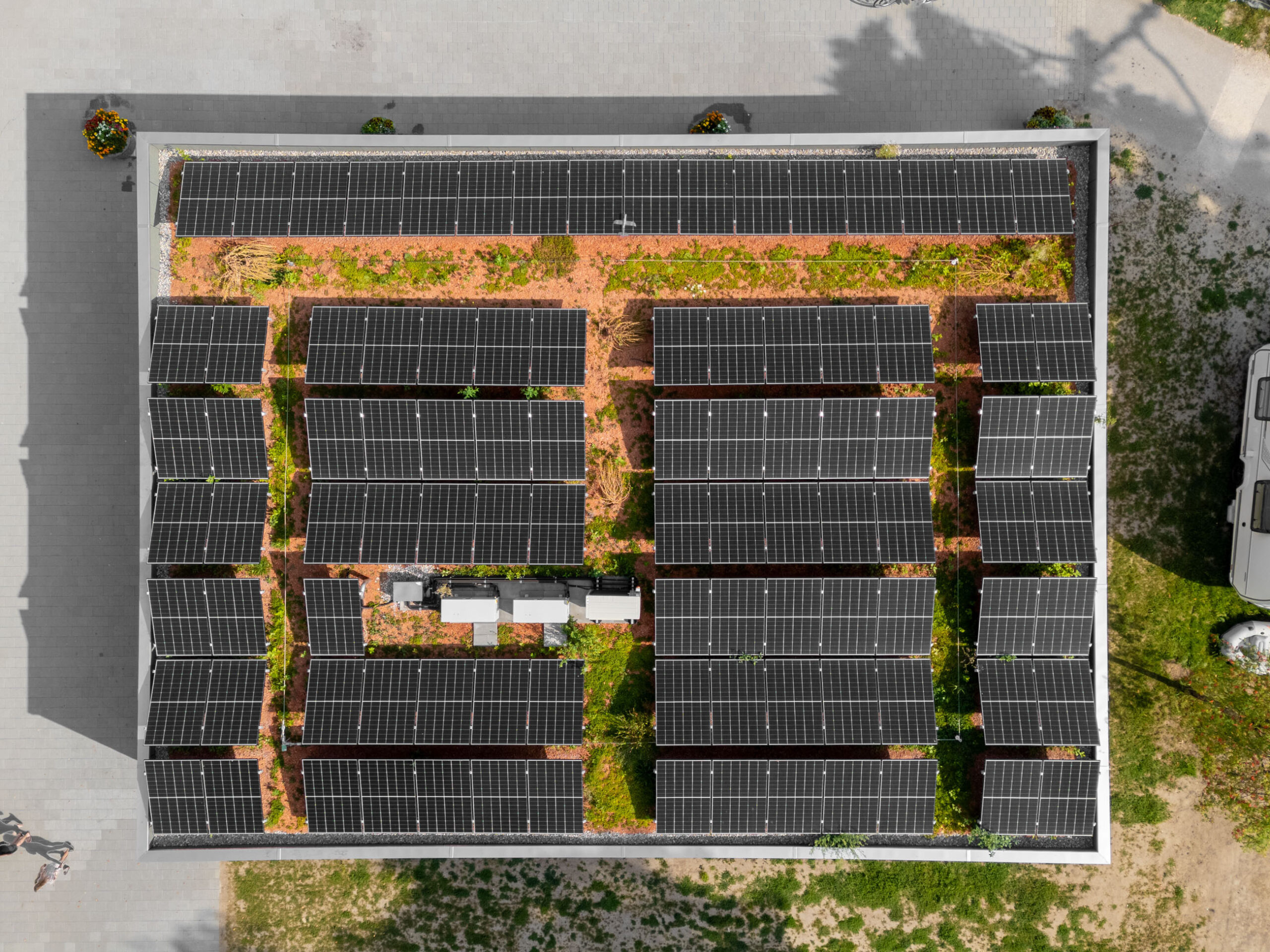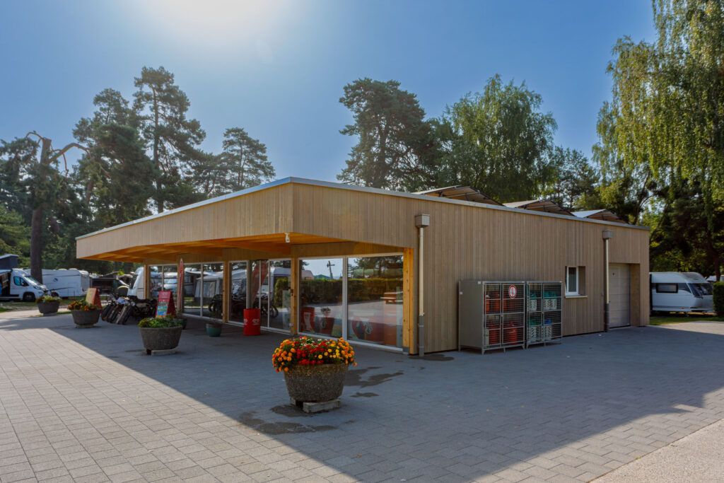 Holzstruktur der Dachkonstruktion im Gebäude des Camping Plage. Innenraum des Ladens mit sichtbarer Holzkonstruktion. Photovoltaikanlage auf dem Dach des Ladens des Camping Plage in Avenches. Luftaufnahme des Camping Plage mit Photovoltaikanlage.